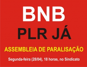 O Sindicato convoca todos os funcionários do Banco do Nordeste para uma assembleia geral nesta segunda-feira (28/04), a partir das 18 horas, na sede da entidade, quando serão discutidos os entraves para o pagamento da PLR aos funcionários. Na oportunidade também serão discutidas ações de mobilização, entre elas a paralisação de agências na terça-feira (29/04), em resposta ao descaso da direção e do Departamento de Coordenação e Governança das Empresas Estatais (DEST).