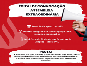 Sindicato dos Empregados em Estabelecimentos de Crédito no Estado de Alagoas, Inscrito no CNPJ/MF sob o nº 12.318.192/0001-68, Registro Sindical nº 46010.001475/00-13, por seu presidente abaixo assinado, no uso de suas atribuições, por meio deste, vem convocar funcionários e exfuncionários (dispensados após 27/08/2011) do Banco Santander, que exerceram de forma eventual ou efetiva a função de Gerente Van Gogh de 29/11/2008 até a presente data, para assembleia extraordinária para o dia 28/08/2025, às 18:00hs, a ocorrer na sede do Sindicato, em primeira convocação, e às 18:30hs em segunda, destinada aos citados empregados, com a finalidade de prestar informações acerca da ação coletiva de ajuizada em benefício destes, assim como para definir procedimentos a serem adotados na condução dessas ações e respectivas execuções.