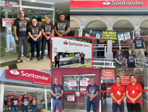Na manhã desta terça-feira (4), o Sindicato interrompeu as atividades em todas as sete agências do Santander no estado, em paralisação parcial até às 14h, dentro do Dia Nacional de Luta do Santander. A ação foi um recado que não haverá silêncio enquanto o banco continuar atacando direitos e desmontando o atendimento bancário no país.