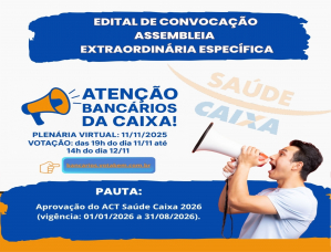 O Sindicato dos Bancários de Alagoas convoca todos (as) os (as) bancários(as) beneficiários(as) titulares do Saúde Caixa, sócios e não sócios, integrantes da base territorial deste Sindicato e que prestam serviços à Caixa Econômica Federal, para participarem da Assembleia Específica Remota, que será realizada nos dias 11 e 12 de novembro de 2025.