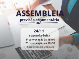 O Sindicato convoca seus associados, em dia com as obrigações estatutárias, para a Assembleia Geral Ordinária que debaterá e deliberará sobre a Previsão Orçamentária Anual referente ao exercício de 2026, conforme determina o art. 167 do Estatuto Social. A assembleia será realizada no dia 24 de novembro de 2025, na sede do Sindicato, localizada na Rua Barão de Atalaia, nº 50, Centro, Maceió/AL. A primeira convocação ocorrerá às 18h, e a segunda às 18h30, podendo a assembleia ser instalada com qualquer número de associados após o prazo regimental, nos termos do art. 95.