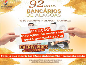 As inscrições seguem abertas pelo e-mail: 92anosinterior@bancariosal.com.br