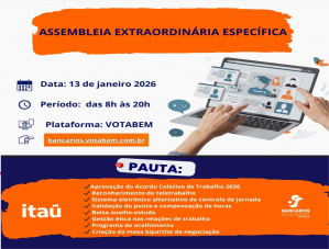 O Sindicato convoca todos os empregados e empregadas do Banco Itaú e empresas do grupo, sócios e não sócios, para participarem da Assembleia Específica que irá deliberar sobre o Acordo Coletivo de Trabalho com vigência de 1º de janeiro de 2026 a 31 de dezembro de 2026. A votação será realizada de forma on-line, pela plataformaVotaBem, no dia 13 de janeiro de 2026, no horário das 8h às 20h.